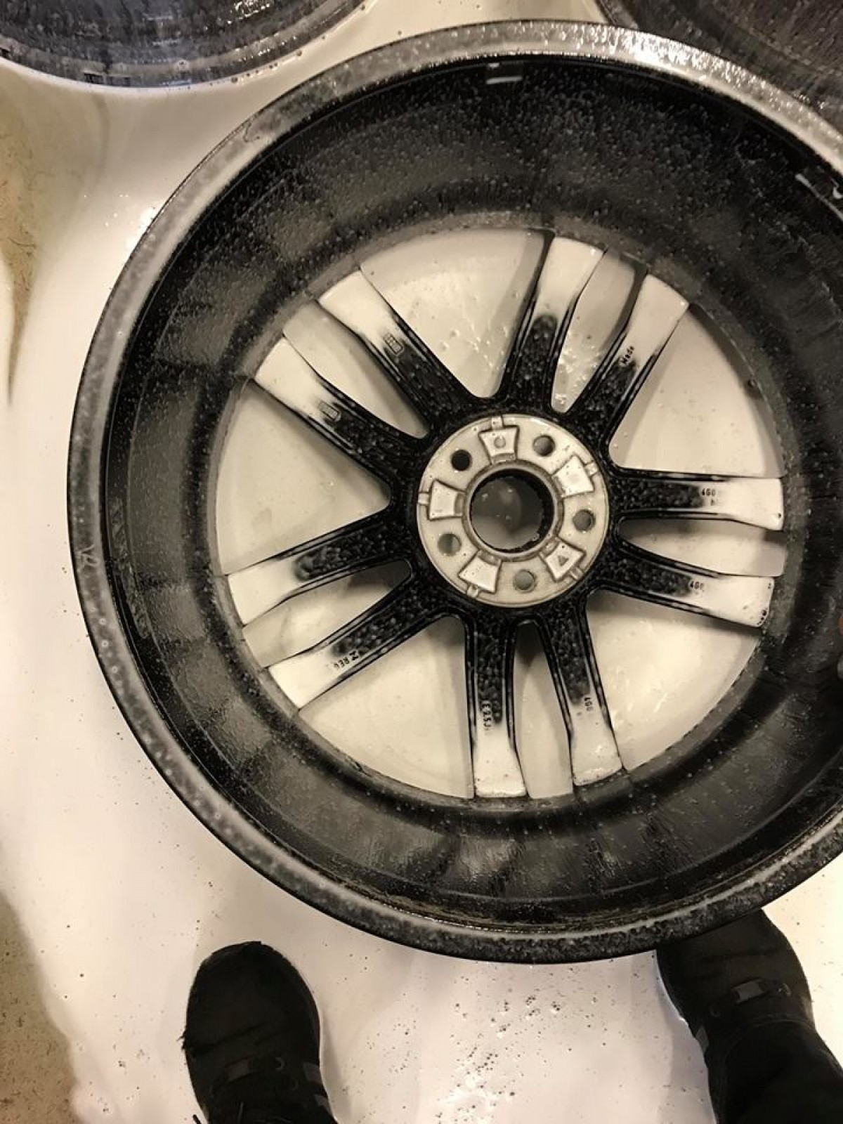 Ha på deg hanskene - jekk opp bilen og demonter hjulene skånsomt. Dusj inn hver av sidene med felgrensen og la produktet jobbe litt på felgen. Spyl av og gjenta - bruk kost for å få av all dritten.
