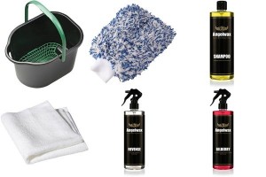 Fyll opp vaskebøtta med lunket vann og hell i en kork av Angelwax Shampoo. Svamp bilen fra taket og nedover og avslutt med å høytrykkspyle bilen skikkelig nedenifra og oppover.