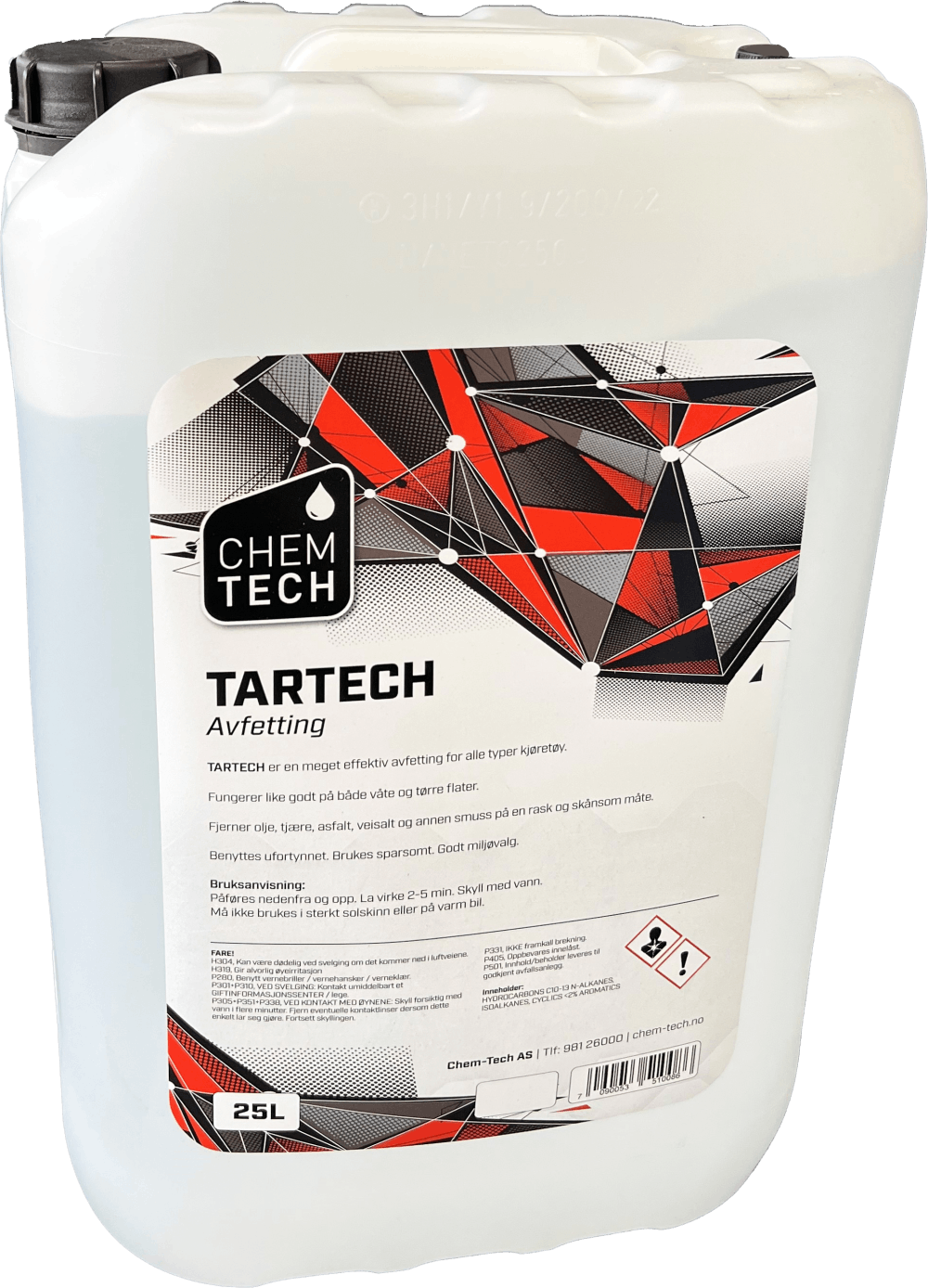 Chem-Tech Tartech er et kraftig petrokjemisk avfettingsmiddel som er særdeles effektivt til fjerning av asfalt, olje,  salt mm. Selvom Tartech er kraftig er den allikevel skånsom mot billakken og snill utslippsmessig.