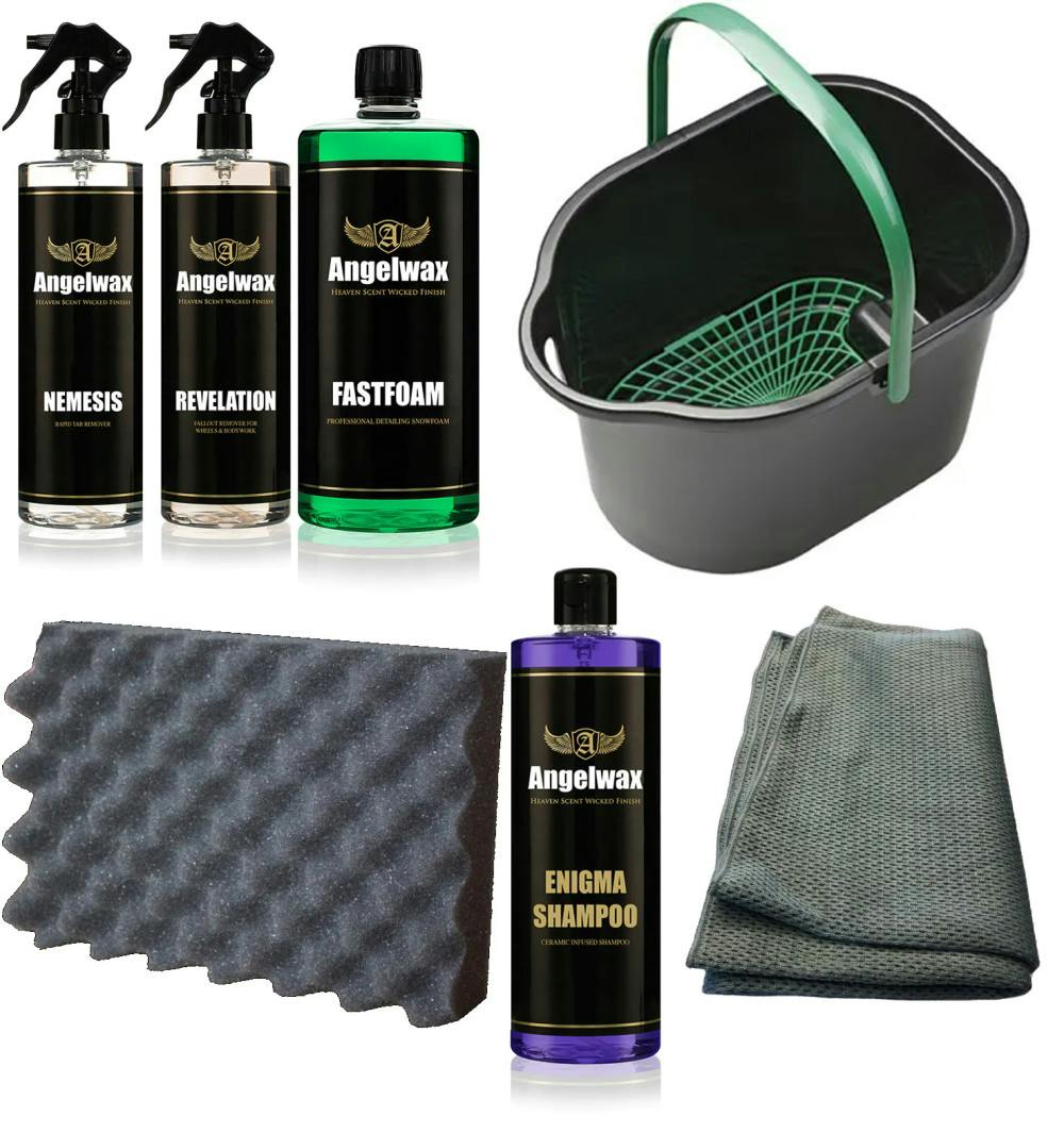Ny runde med Fast Foam legges over bilen og fyll opp bøtta med lunkent vann og litt såpe og svampvask grundig ovenifra og ned. Spyl av grundig og gi bilen en runde med Angelwax Enigma keramisk shampoo - spyl av igjen og avslutt med å tørke den skikkelig tørr med Diamond Perl tørkehåndkle.