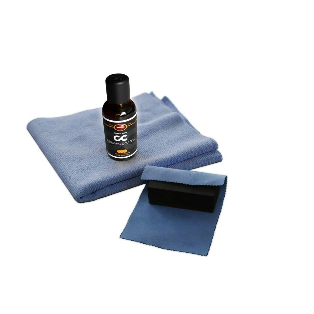 Settet inkluderer 50 ML med keramisk coating, 1 påføringssvamp og en mikrofiberduk.