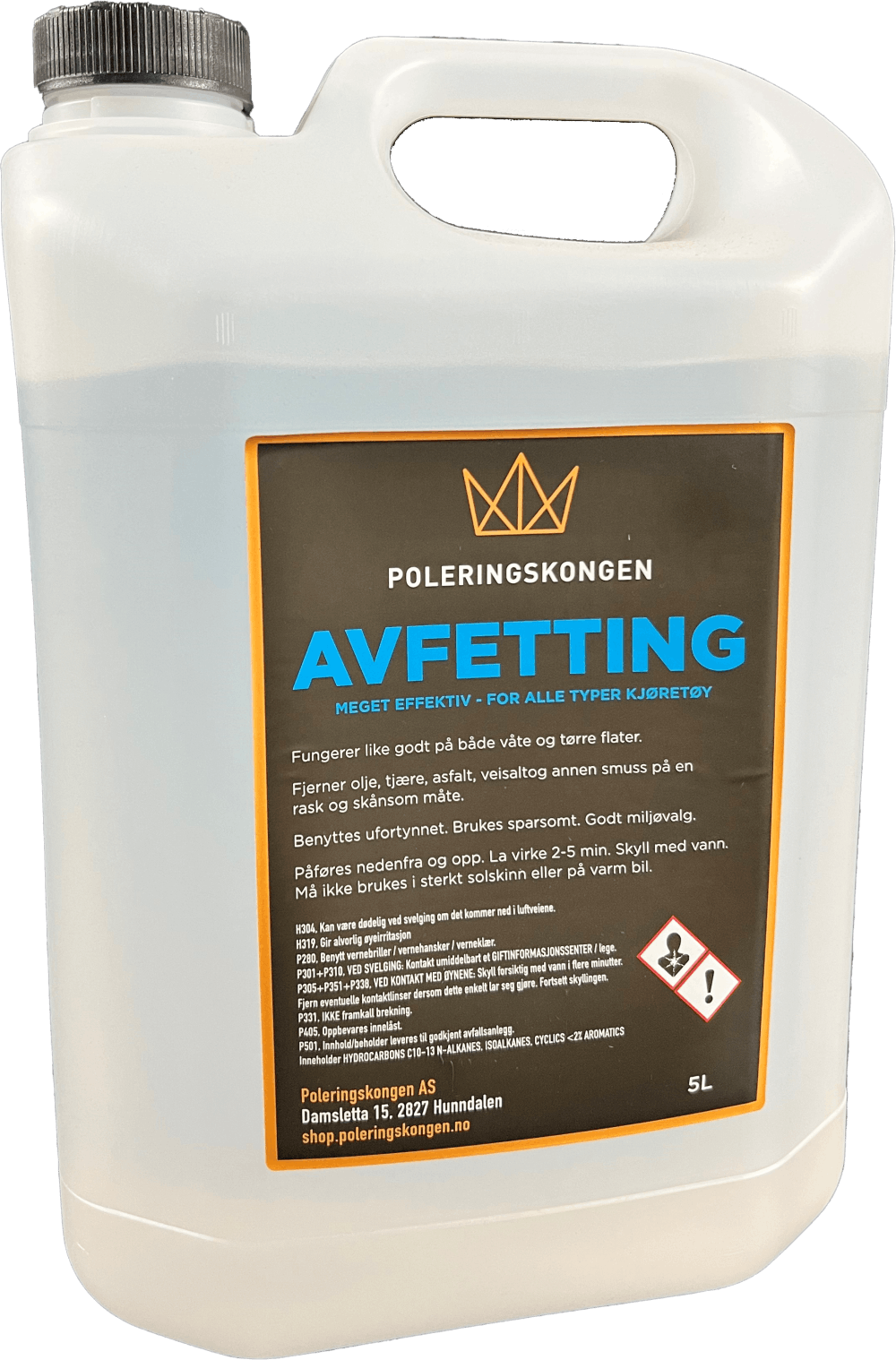 Poleringskongen Avfetting er ett kraftig petrokjemisk avfettingsmiddel til fjerning av asfalt, olje og salt fra bilen.