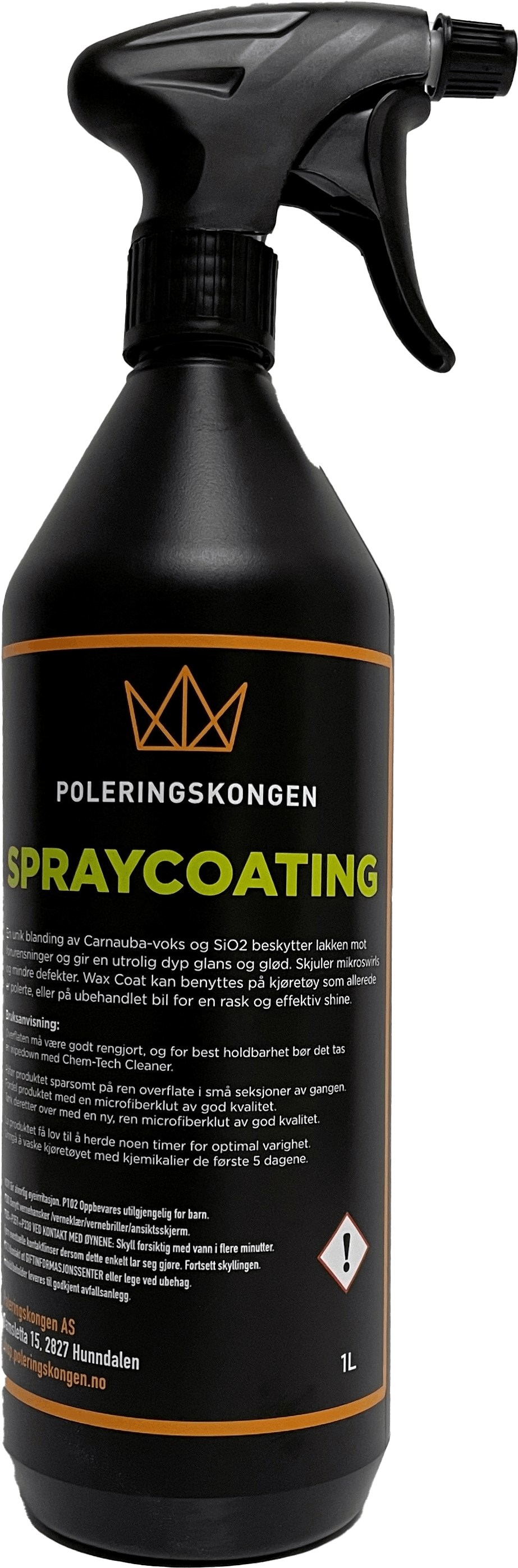 Poleringskongen - Spraycoating - 1L er en unik blanding av Carnauba-voks og Si02 som beskytter lakken mot forurensinger og gir en utrolig dyp glans og glød.