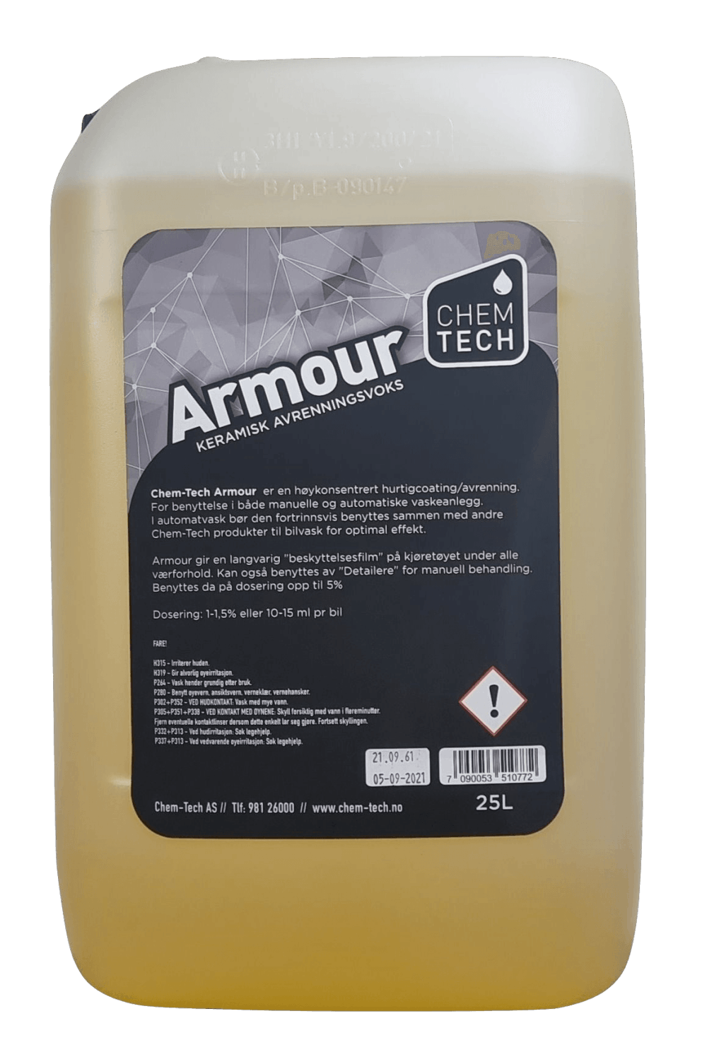 Chem - Tech - Armour - 25L er en høykonsentrert hurtigcoating / avrenningsmiddel som kan kan benyttes i både manuelt og med spraykanner / automatiske vaskeanlegg.